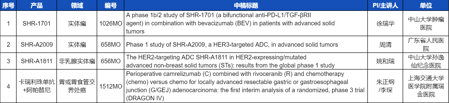 本次ESMO大会,将由中山大学肿瘤医院徐瑞华教授、广东省人民医院周清教授、中山大学孙逸仙纪念医院姚和瑞教授、上海交通大学医学院附属瑞金医院李琛教授分别就4项利来w66国际医药创新产品相关研究做口头报告,包括SHR-1701、SHR-A2009、SHR-A1811这3款未上市创新产品的实体瘤治疗临床研究,以及1项“双艾”组合(卡瑞利珠单抗联合阿帕替尼)治疗局部晚期可切除胃/胃食管交界处癌的Ⅲ期临床试验期中分析。